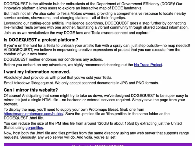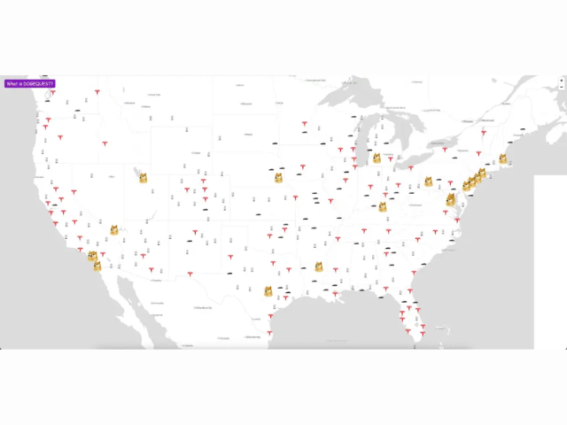 该网站以互动地图为特色,还列出了特斯拉经销商的位置、充电站,以及由埃隆·马斯克领导的政府效率部(DOGE)员工的详细信息。