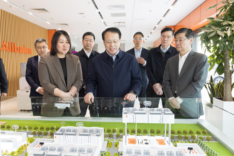 在枫泾工业园区北区,阿里云华东智能算力中心正在建设。下午,龚正一行来到项目基地,察看沙盘,详细了解园区整体规划、算力建设节点、数字经济产业布局,并对照运维大屏,听取节能降耗技术管理情况。龚正鼓励企业加大创新力度,促进能耗降低和效率提升,更好保障上海人工智能和数字经济产业发展,并吸引更多产业链上下游企业入驻。