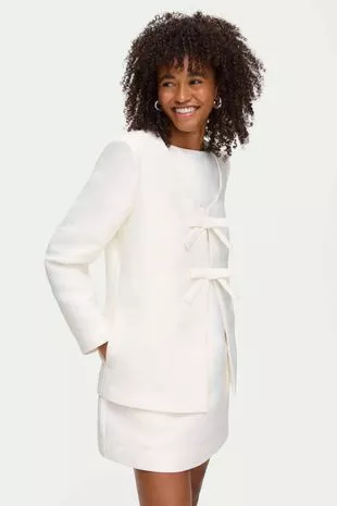 第四件也是最后一件是Beau Bow缎面西装外套(售价145英镑),同样,它的设计适用于任何可能的婚礼时刻。它的长袖设计很适合春天的婚礼,而蝴蝶结的细节为设计增添了一种俏皮的感觉,用隐藏的罂粟花系扣闭合。