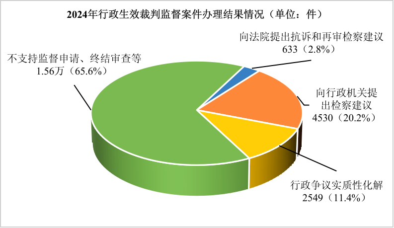 1.行政生效裁判监督更加有力有效。2024年,全国检察机关共办理行政生效判决、裁定、调解书监督案件2.33万件,同比下降6.8%。办案数量较多的地区有:广东1974件、山东1787件、北京1589件、河南1349件、江苏1292件,合计占34.3%。从办理结果看,对认为确有错误的生效裁判提出抗诉和再审检察建议633件,占比2.8%;在履行诉讼监督职责中针对行政机关违法行使职权或者不行使职权的提出检察建议4530件,占比20.2%;综合运用监督纠正、公开听证、司法救助、释法说理等促进行政争议实质性化解2549件,占比11.4%。三者合计占34.4%,努力让人民群众有更多的获得感。从抗诉和再审检察建议情况看,提出抗诉258件,同比上升33.9%,同期法院审结改变率74%。提出再审检察建议375件,同期法院审结改变率为90.6%。对检察机关提出监督意见后法院未采纳的,跟进监督46件。