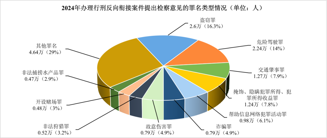 5. 行刑反向衔接案件涉及罪名相对集中。2024年,全国检察机关共对被不起诉人提出行政处罚的检察意见16.02万人,提出检察意见较多的罪名有:盗窃罪2.6万人,危险驾驶罪2.24万人,交通肇事罪1.27万人,掩饰、隐瞒犯罪所得、犯罪所得收益罪1.24万人,帮助信息网络犯罪活动罪0.98万人,诈骗罪0.79万人,故意伤害罪0.79万人,非法狩猎罪0.52万人,开设赌场罪0.48万人,非法捕捞水产品罪0.47万人,合计占比71%。