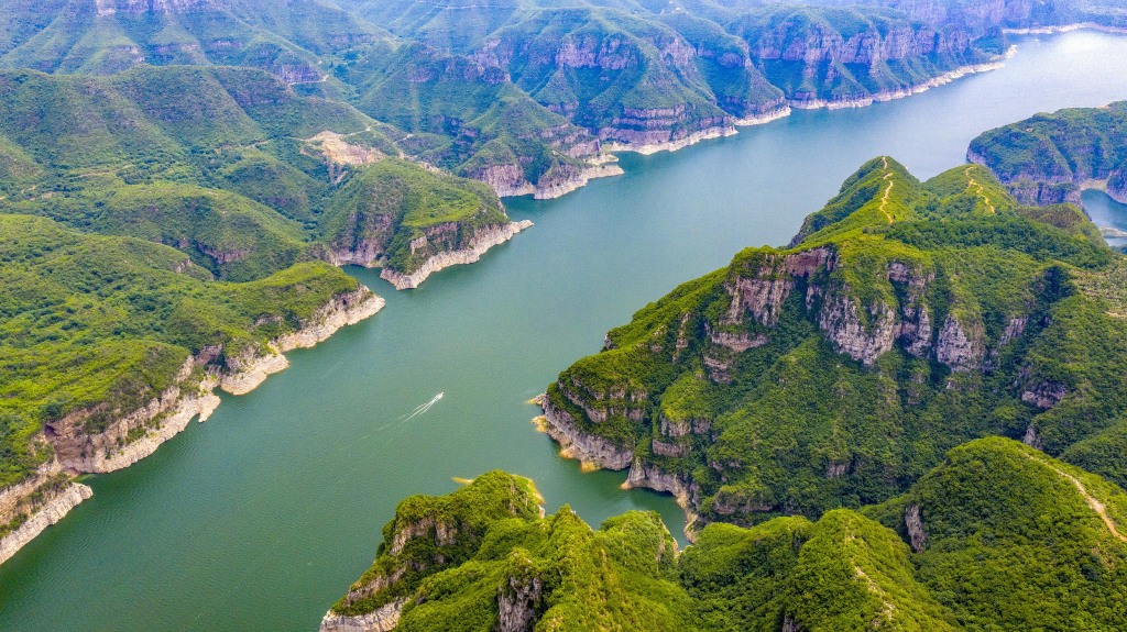 2024年5月31日,河南省洛阳市新安县石井镇黄河岸边山水交融,游船穿梭,形成一幅美丽的画卷。视觉中国图