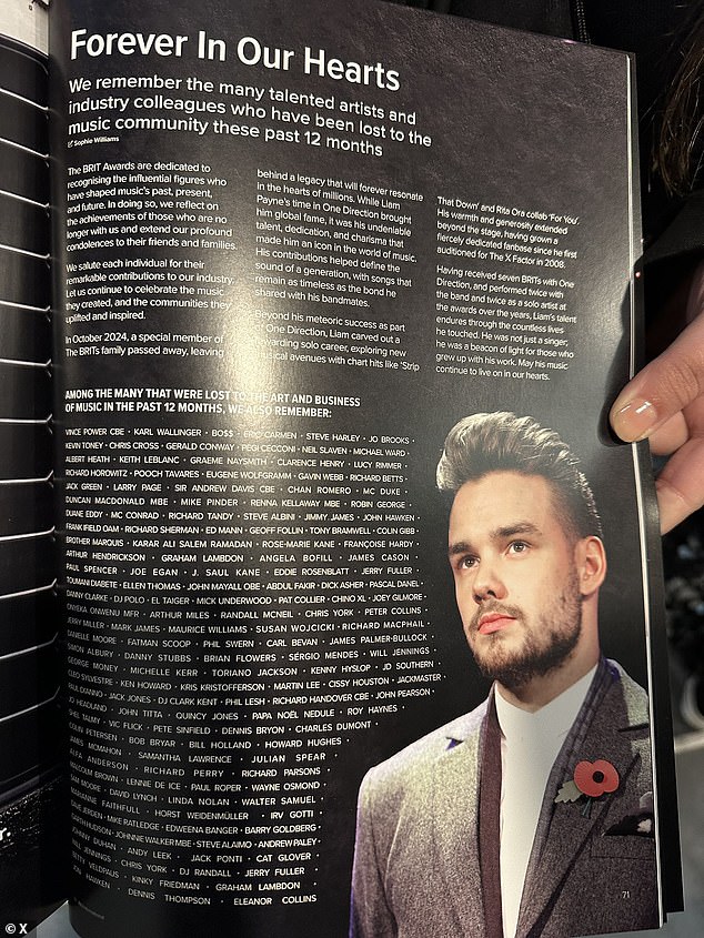 主持人杰克·怀特霍尔介绍了这一环节,他说:“我们在英国有很多关于利亚姆的美好回忆,所以今晚我们庆祝他的遗产,回顾并记住这位杰出的利亚姆·佩恩。”