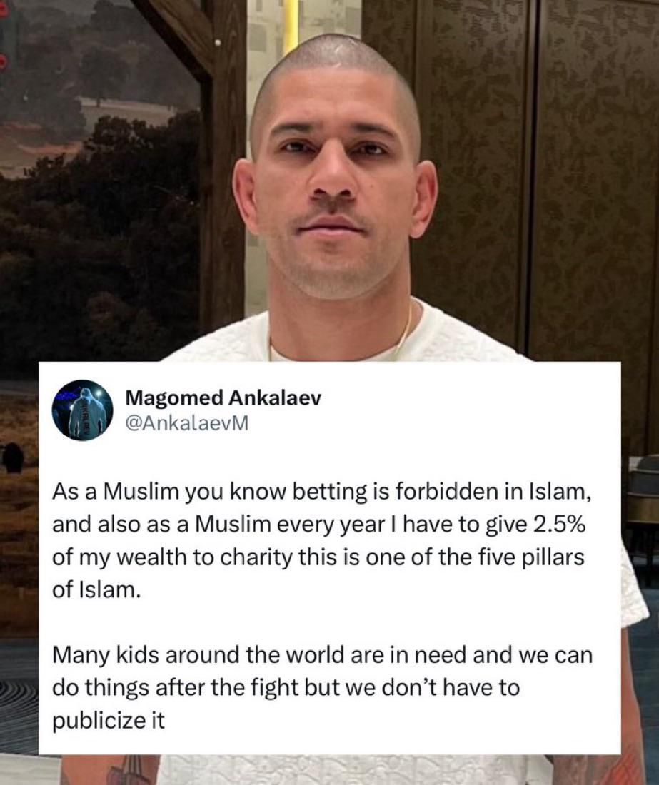 安卡拉耶夫回答说:“作为一名穆斯林,你知道赌博在伊斯兰教是被禁止的,而且作为一名穆斯林,每年我必须把我财富的2.5%捐给慈善机构——这是伊斯兰教的五大支柱之一。”“世界上有很多孩子需要帮助,我们可以在比赛结束后做些事情,但我们不需要宣传。”