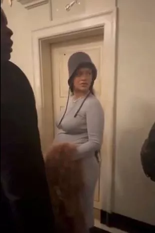 蕾哈娜穿着一件时髦的棕色细条纹夹克,腰间系着一条醒目的黑色腰带。鉴于这位获奖歌手最近喜欢穿宽松的衣服,人们进一步猜测她可能是第三次怀孕。