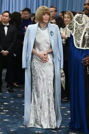 安娜·温图尔紧随其后,以一种引人注目的姿态出现在红毯上,整个会场的目光都集中在她身上。这位75岁的时尚大亨穿着一件银色缎面礼服,上面装饰着花卉细节,散发出优雅的气息。为了配合大都会艺术博物馆慈善晚会的主题,她最后穿了一件浅蓝色的长衬西装外套。