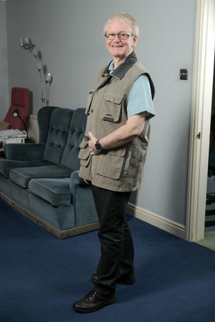 史蒂夫穿着他那件旧的无袖狩猎夹克来展示他减了多少体重,现在他有12英石了(图片:提供)