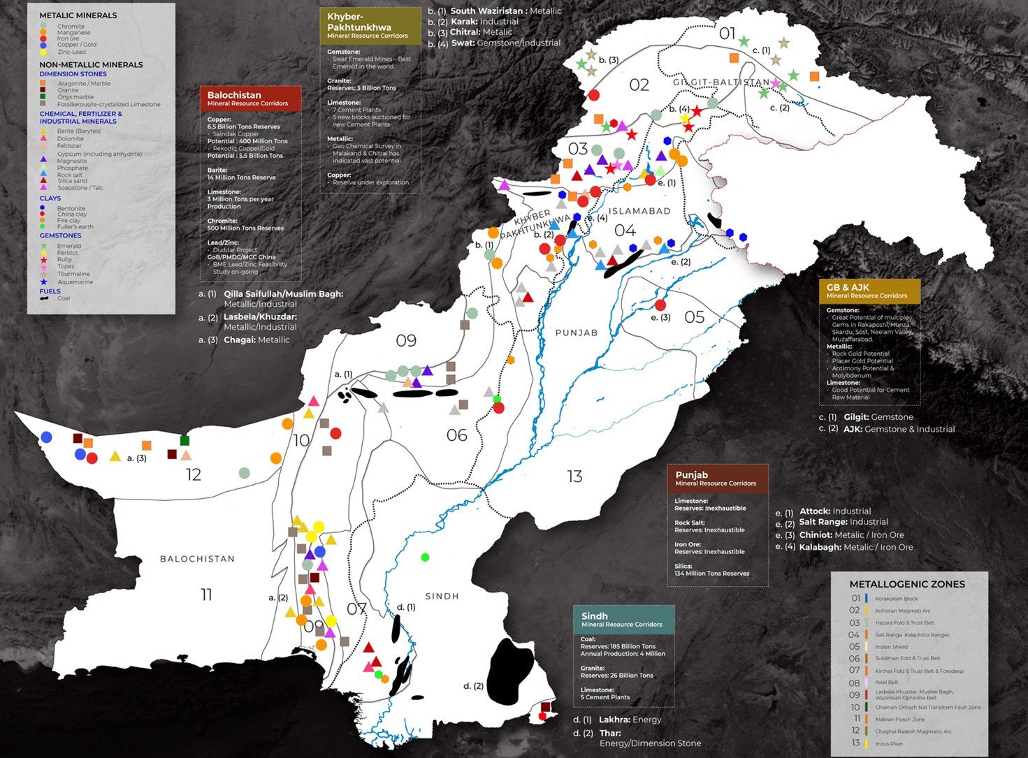 他说,信德省和俾路支省的许多地方正在进行大规模的煤炭、黄金和铜开采,许多其他矿物,如铬铁矿、铁、锆、铅、锌、钴、钛、锰、锂和其他稀土元素(REEs)仍未开发。