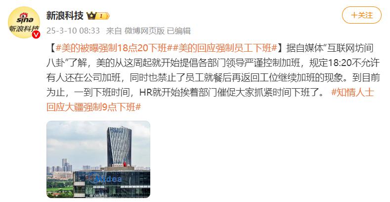 3 月 10 日,# 美的被曝强制 18 点 20 下班 # 话题登上微博热搜,引发网友热议。