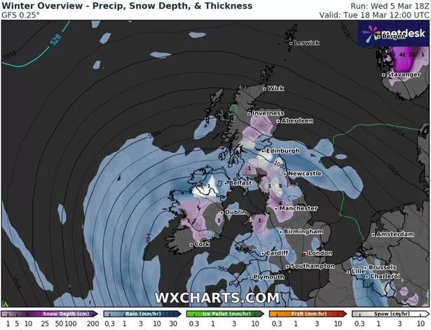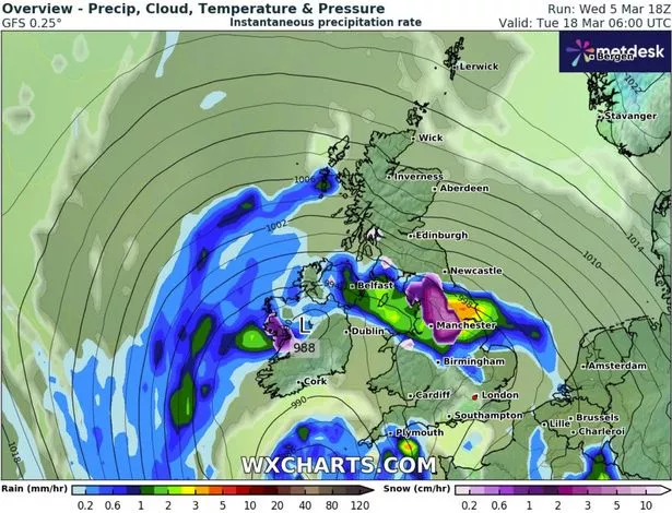 WXCharts的地图显示,确切的日期是3月17日,当时我们可以看到晚上每小时降雪量为两英寸,受影响最严重的是英格兰北部和苏格兰南部。