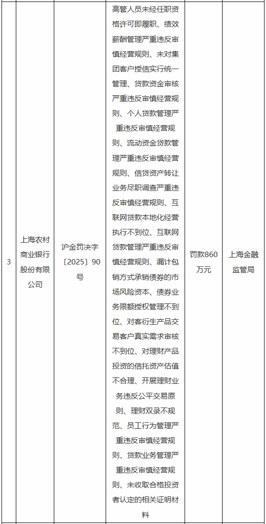 上海农商行被罚860万元,涉绩效薪酬管理严重违反审慎经营规则等18项违法违规行为