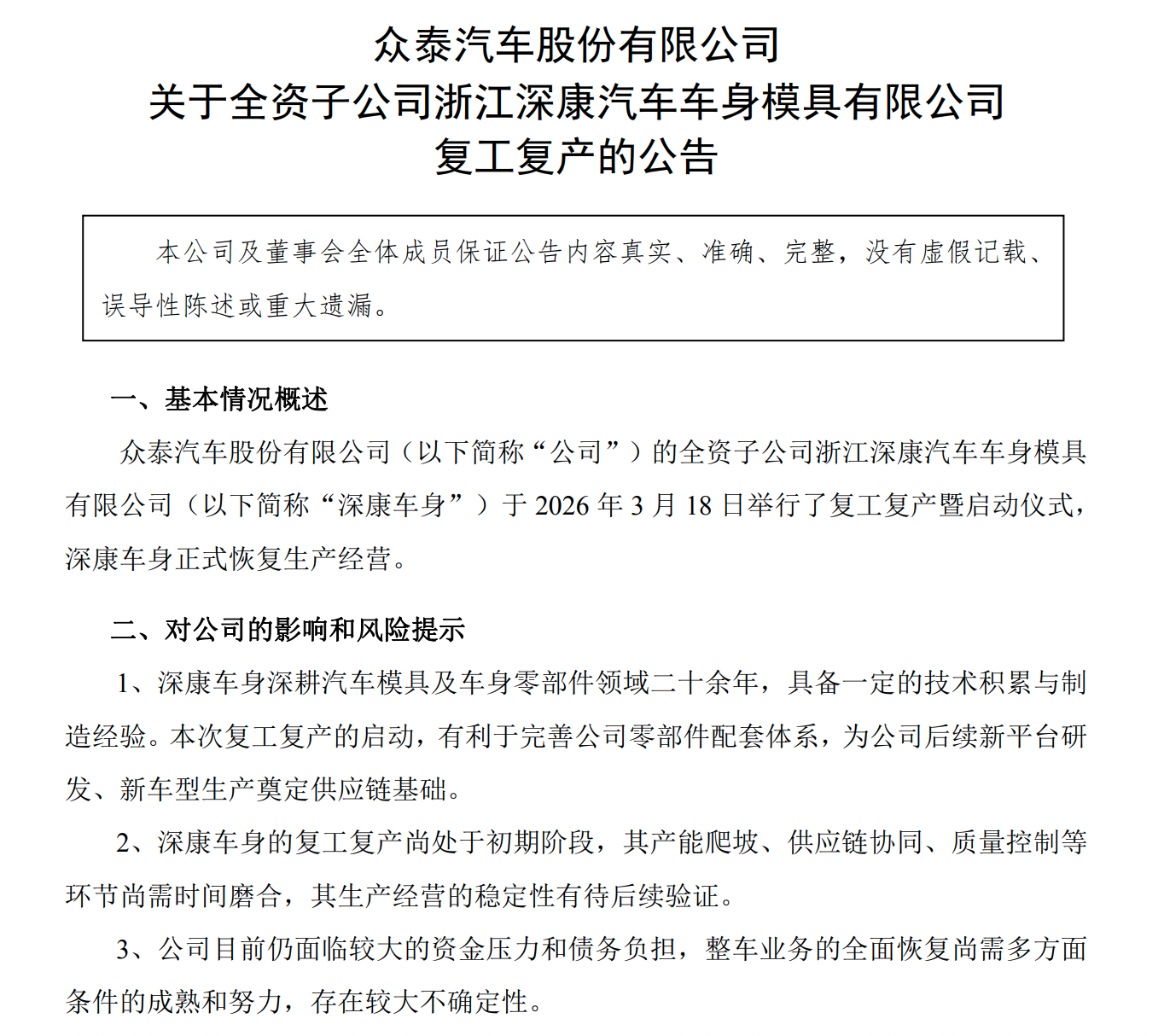 3月18日,众泰汽车(000980.SZ)发布公告称,公司全资子公司浙江深康汽车车身模具有限公司(简...