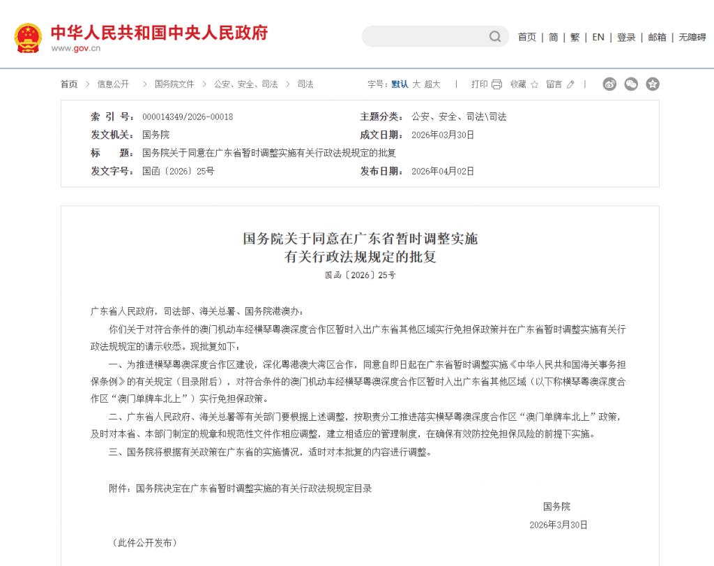 4月2日,中国政府网发布《国务院关于同意在广东省暂时调整实施有关行政法规规定的批复》,同意自即日起在...
