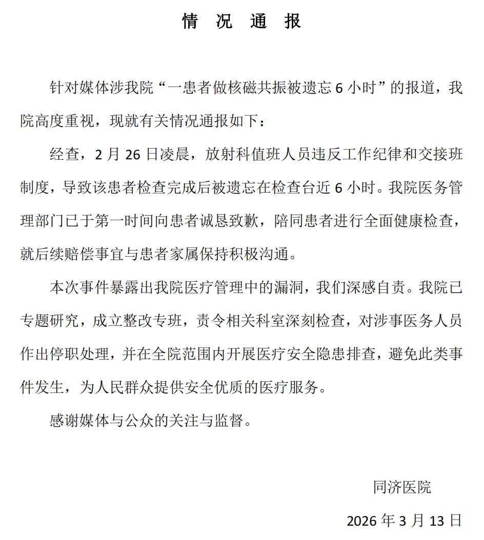 同济医院通报“一患者做核磁共振被遗忘6小时”科学