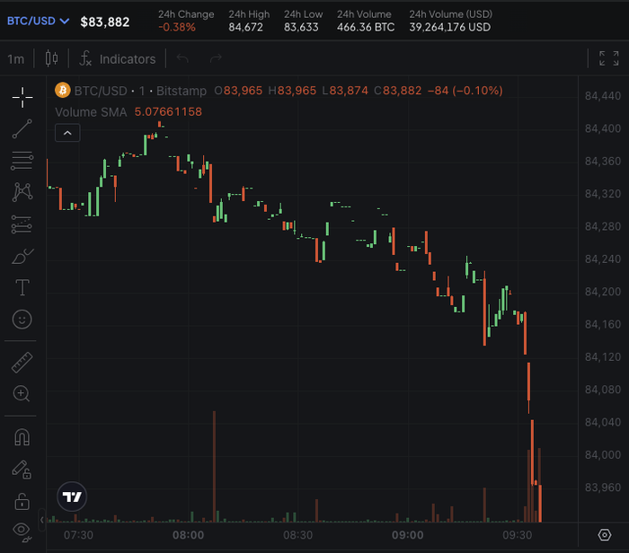 3月16日,Bitstamp报价显示,比特币价格向下跌破84000美元,现报83882美元/枚,日内...