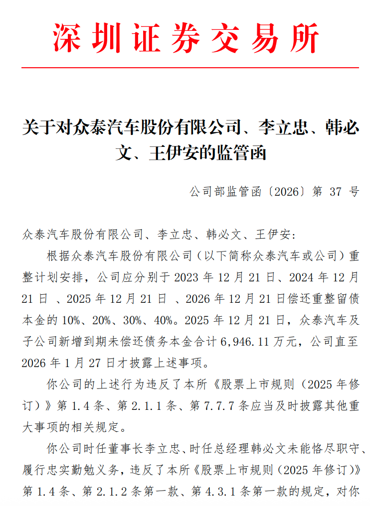 未及时披露新增到期未偿还债务近7000万元,众泰汽车收到深交所监管函科学
