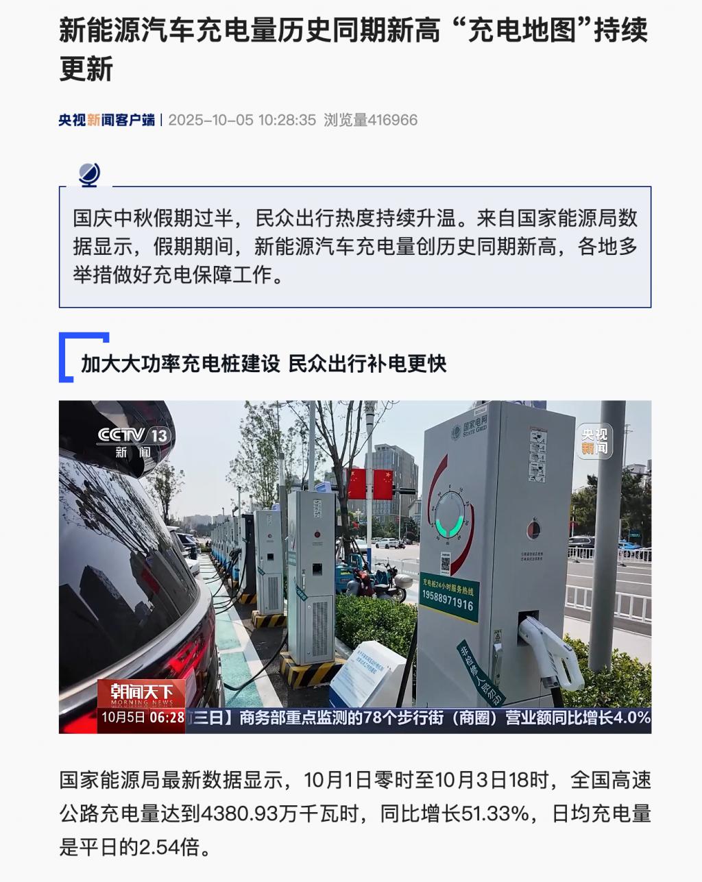 IT之家10月5日消息,据央视新闻援引国家能源局数据,2025国庆中秋假期期间,新能源汽车充电量创历...