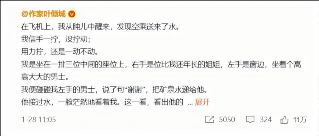 最近作家叶倾城写了自己坐飞机的经历。当时她接到空乘送的矿泉水,想喝,拧不开,就她下意识找身旁的男士。...