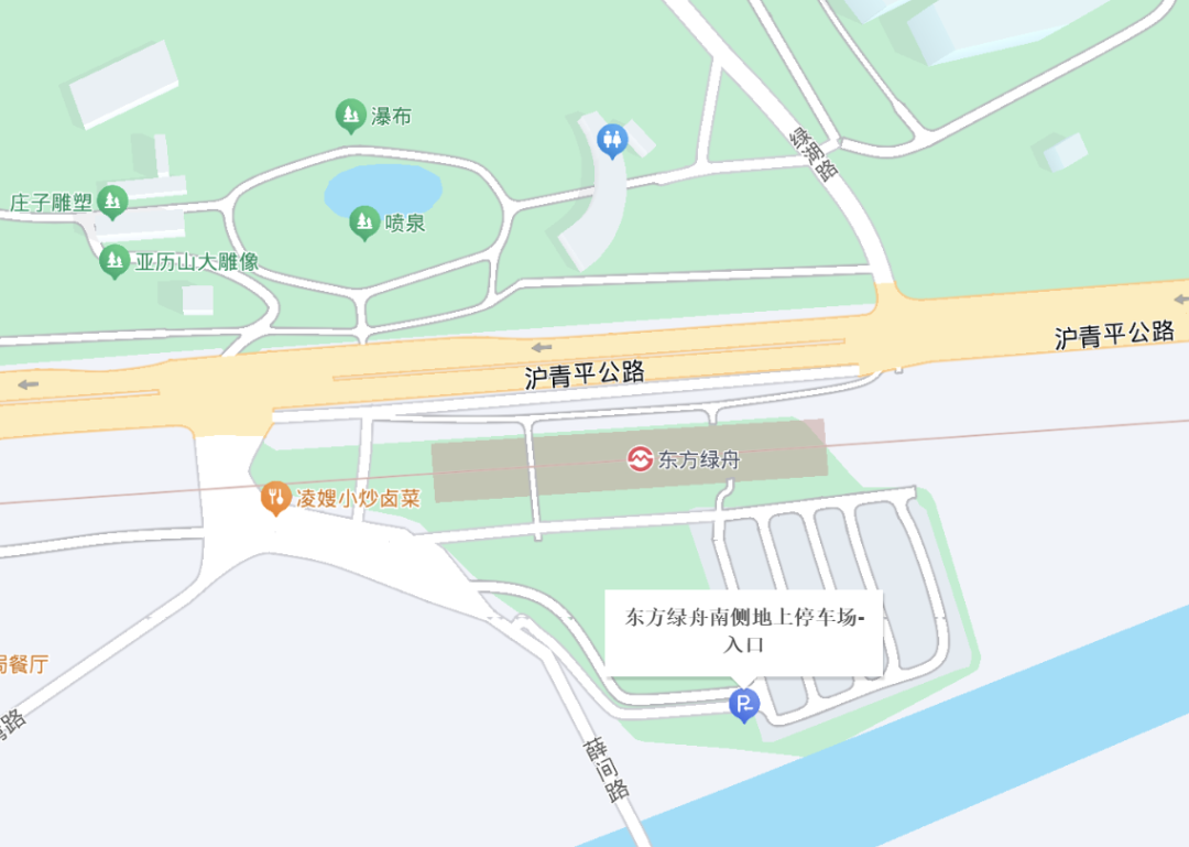 位于东方绿舟地铁站南侧的地面停车场,按实际停车线停放车辆,根据停车场收费标准收费停车。