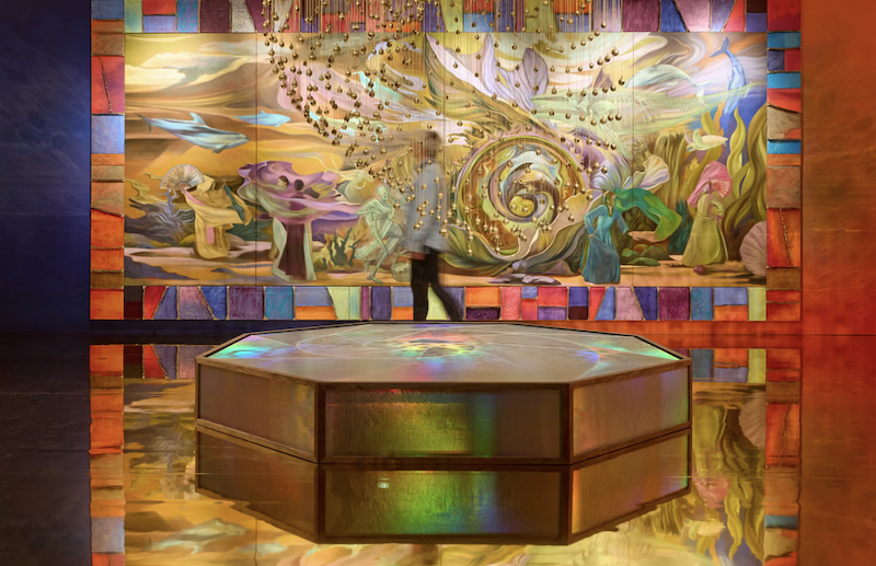 展厅里,伴随着叮当作响的铃铛声、鲸鱼的歌声、无线电波的呼啸声、风铃声,以及老式电话持续不断的鸣叫声,观众可以看到出生于温哥华的韩国艺术家扎迪·夏(Zadie Xa)的装置作品。所有的声音都来自悬挂着的巨大人造贝壳。艺术家将海底的光线洒满墙壁,小小的萨满铃铛像海螺一样盘旋在八角形的台子上,台子上闪烁着彩虹般的光芒,整个景象都倒映在展厅的地板上。墙上则挂满了画作,这些画作描绘了韩国民间传说人物、游弋的海豚、鱿鱼和海龟。而作品标题《月光下的深海回声告白:你的祖先是鲸鱼,地球记得一切》说明了一切。