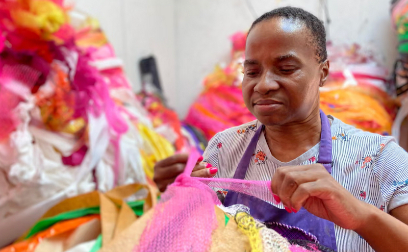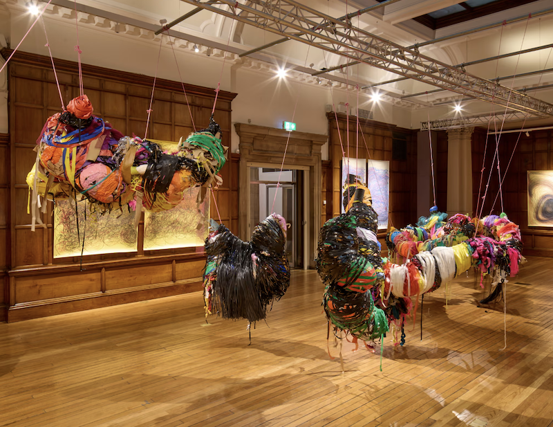 十座大型雕塑悬挂于空中,观众可以在它们之间穿梭。艺术家奈娜·卡卢(Nnena Kalu)的创作方式是层层重复地捆绑、包裹、打结。卡鲁用胶带、保鲜膜、回收塑料、织物、扎带、纸板以及散落的人造纺织材料等,在简单的骨架上创作。她这种不断叠加、重复的创作过程取决于艺术家的专注力和毅力。它们高耸于观者之上,或向外伸展,或向内咆哮。它们被束缚,或被解放,充满着变化。这些具象的形态拥有复杂的物理性。