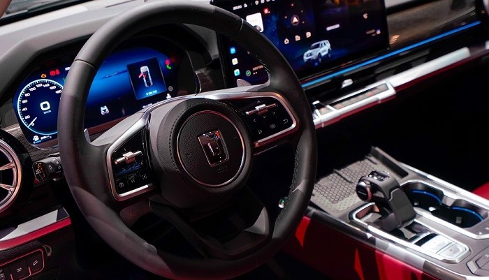 内饰延续硬派与科技融合的风格,12.3英寸全液晶仪表+16.2英寸中控屏构成主交互界面,交互系统及华为HiCar等主流互联协议支持也保持不变。Nappa打孔真皮座椅提供前排通风/加热,后备厢容积根据动力版本差异设计,汽油版常规容积566升(最大扩展1803升),柴油版在此基础上增加50升储物空间。副仪表台集成双50瓦无线快充面板,后方旋钮集中控制驾驶模式与越野功能切换。