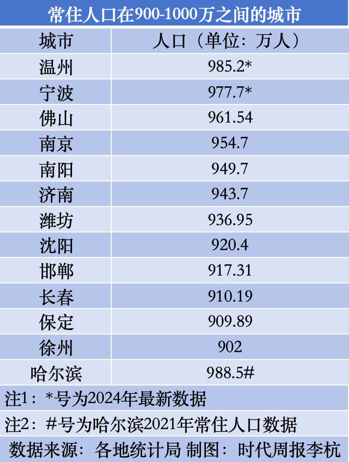 时代周报记者梳理发现,目前全国共有 13 座城市的常住人口处于 900 万至 1000 万区间,其中温州、宁波、佛山、南京四座城市人口规模突破 950 万大关,构成冲击千万人口的第一梯队。