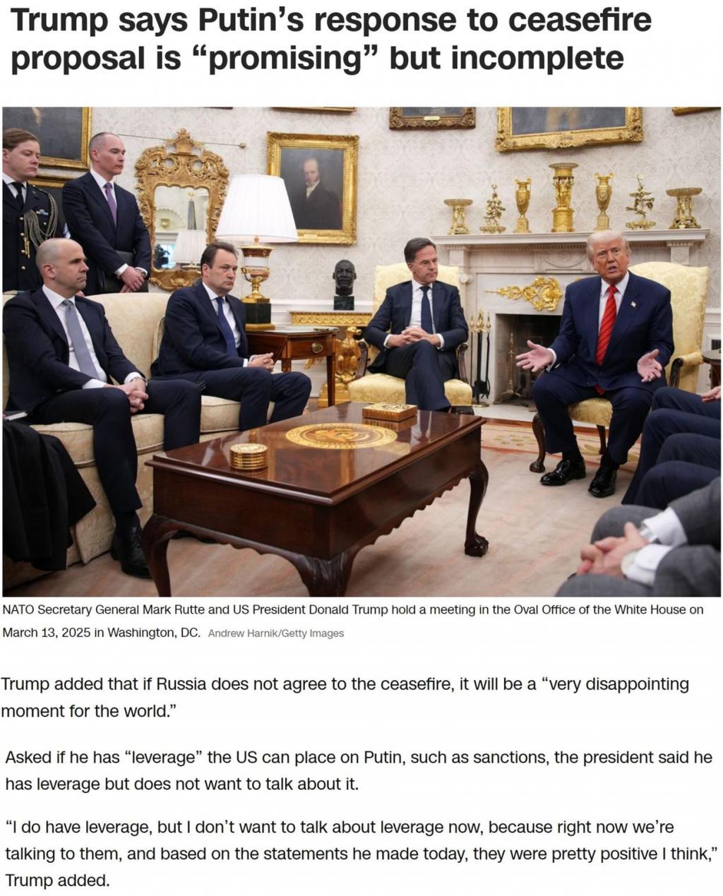 据美国有线电视新闻网报道,美国总统特朗普 13 日在白宫椭圆形办公室会见北约秘书长吕特时对普京当天关于俄乌停火提议的表态作出回应,称普京的表态 " 很有前景但并不彻底 "。
