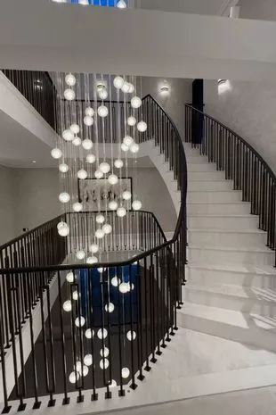 分享的照片展示了令人瞠目结舌的白色大理石台阶,在上升过程中装饰着光滑的黑色扶手。华丽的枝形吊灯镶嵌着白色的玻璃小装饰品,优雅地悬挂在高高的天花板上,照亮了从上层到底层的道路。