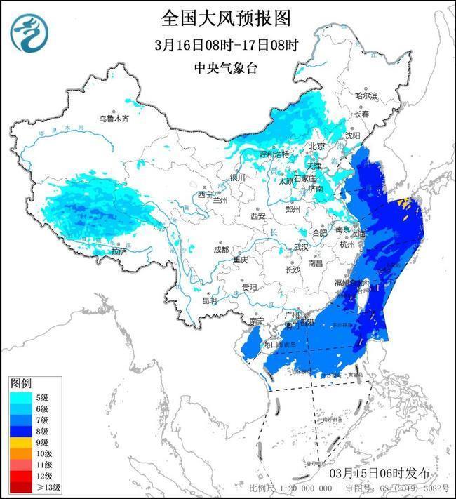 预计,3月15日08时至16日08时,新疆北疆东部、甘肃河西、西藏中西部、内蒙古中部、宁夏、陕西北部、山西中部、河北北部等地将有5~6级大风,阵风7~8级,黄海北部和中部海域、东海大部海域、台湾海峡、台湾以东洋面、南海北部海域、北部湾将有7~8级、阵风9级的大风,其中东海东北部海域的风力可达9级、阵风10级。