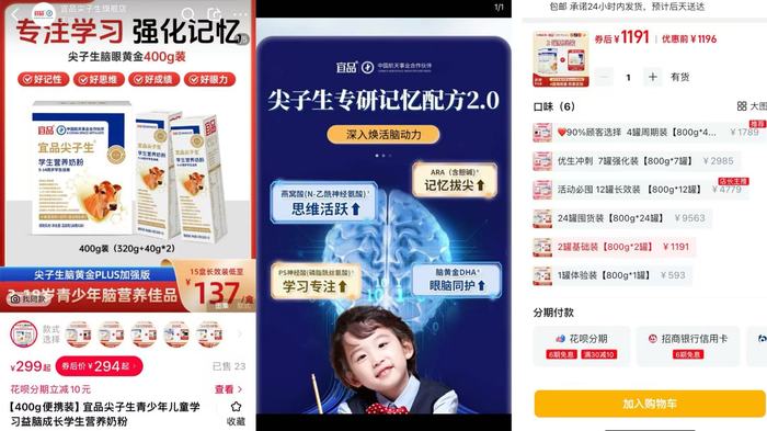 除了形形色色的跨境营养品,奶粉也是“益智”产品的大类。例如,宜品尖子生青少年儿童学习益脑成长学生营养奶粉。
