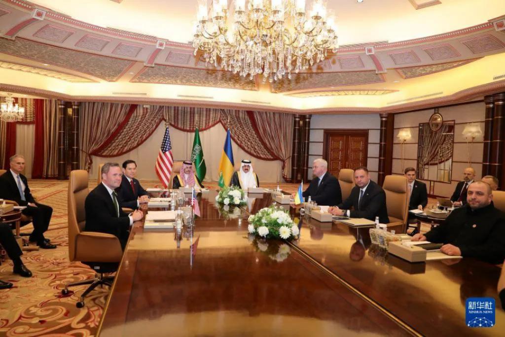 3 月 11 日在沙特阿拉伯吉达拍摄的美国和乌克兰代表团会谈现场 图:新华社