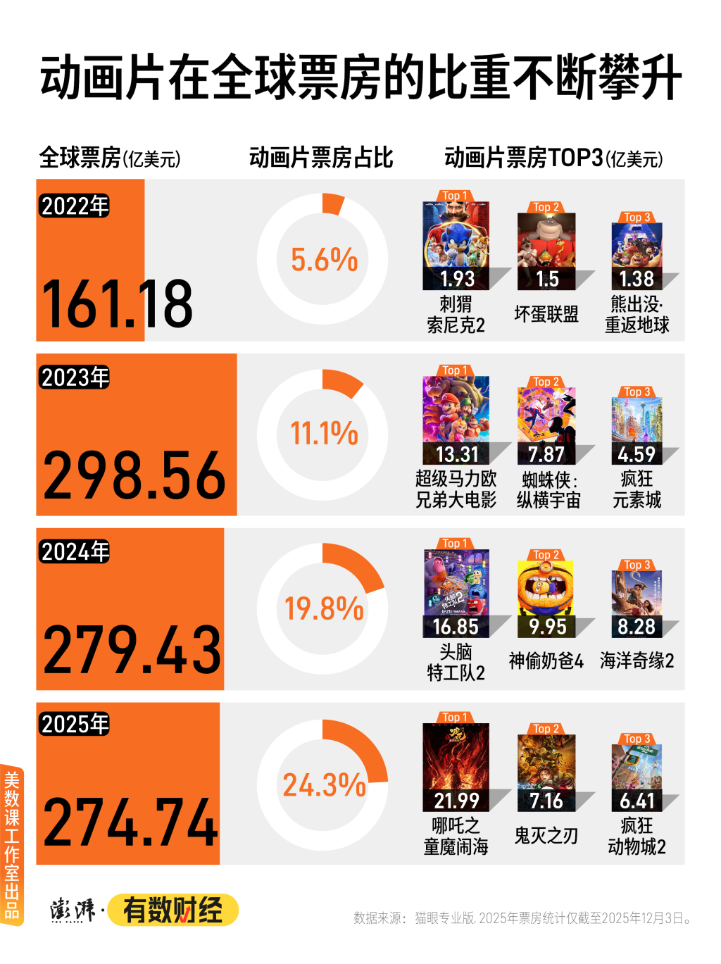 不仅是中国,动画电影在今年全球的电影市场也表现亮眼。美数课工作室梳理发现,截至12月2日,动画电影对今年全球票房的贡献度高达24.4%,相比2022年的5.6%提升明显。国外知名影评网站Collider发文认为,“2025年对动画电影来说是非凡的一年”。