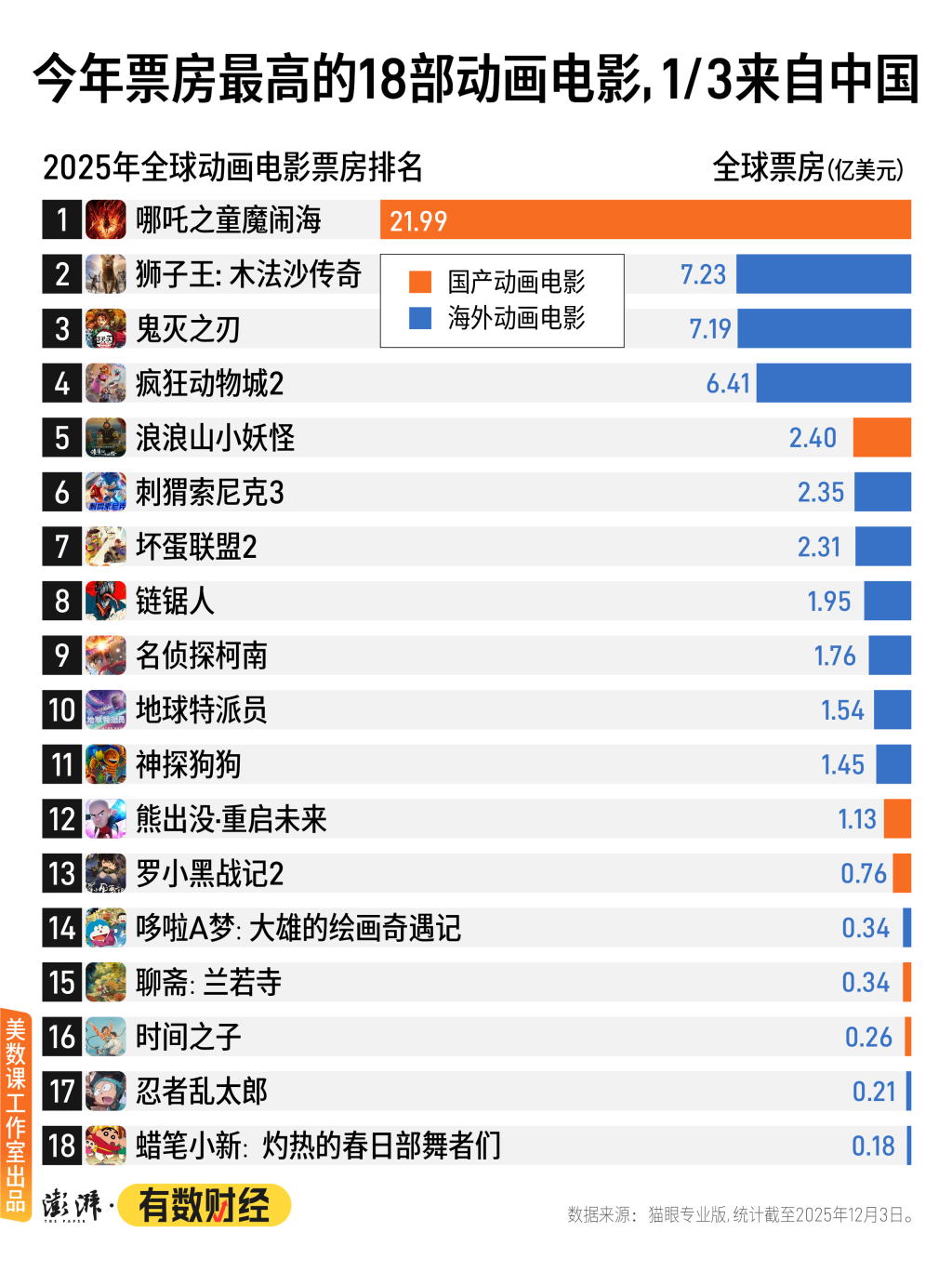 在今年全球票房最高的18部动画电影中,美数课工作室注意到国产动画电影就有6部。