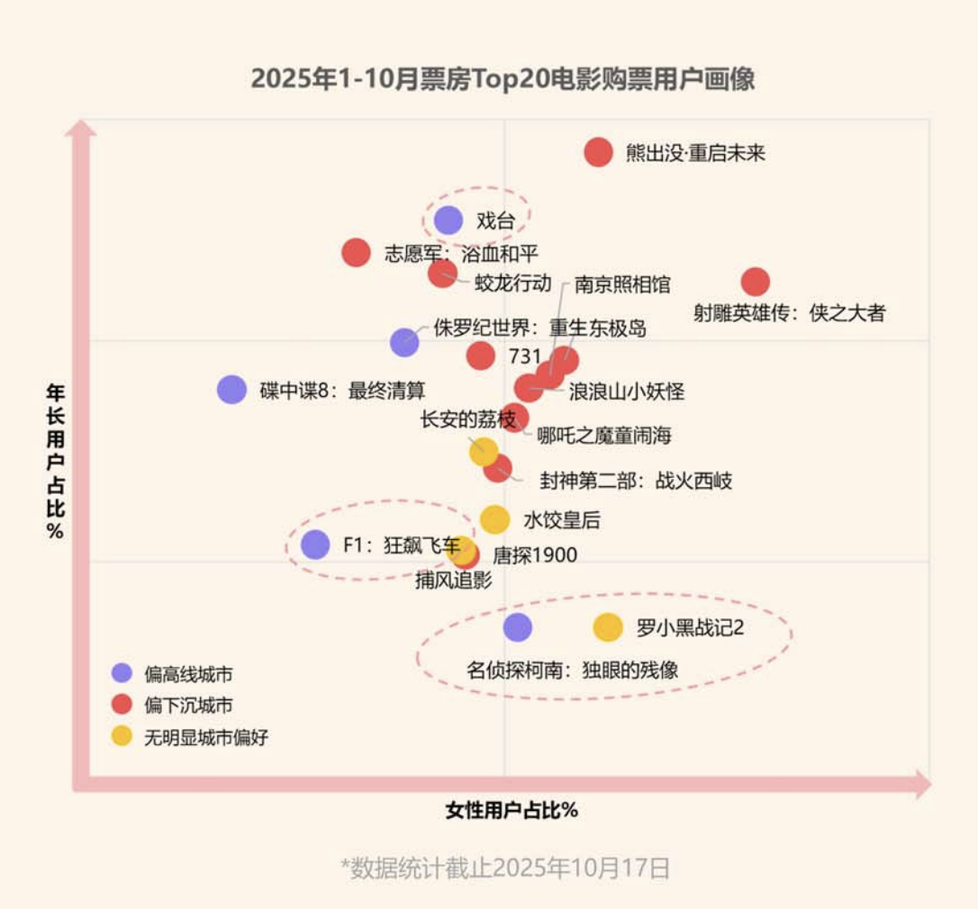 与之形成呼应的,是“不同性别年龄的观众观影偏好不同”。《报告》显示,在2025年前10月上映的电影中,动画相比其他类型片,女性和偏下沉城市的购票者比例都要更高。