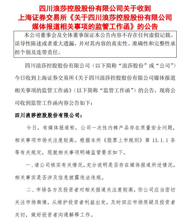 浪莎股份 3 月 15 日晚间公告,收到上交所监管工作函,有媒体报道称,公司一次性内裤产品存在质量安全问题,相关事项市场关注度较高。上交所要求公司核实有关情况,充分说明是否存在媒体报道所述情况,相关事实是否涉及信息披露违法违规。
