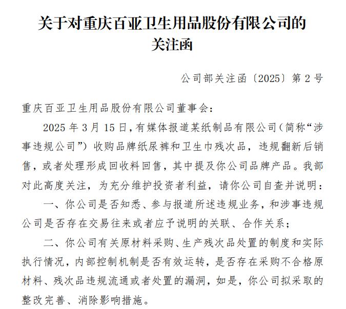 2025 年央视 3 · 15 晚会曝光卫生巾、纸尿裤残次料被翻新 " 二次销售 " 乱象,其中提及百亚股份旗下品牌自由点和好之。3 月 16 日早间,百亚股份收到深交所下发的关注函。有媒体报道某纸制品有限公司(简称 " 涉事违规公司 ")收购品牌纸尿裤和卫生巾残次品,违规翻新后销售,或者处理形成回收料回售,其中提及公司品牌产品。