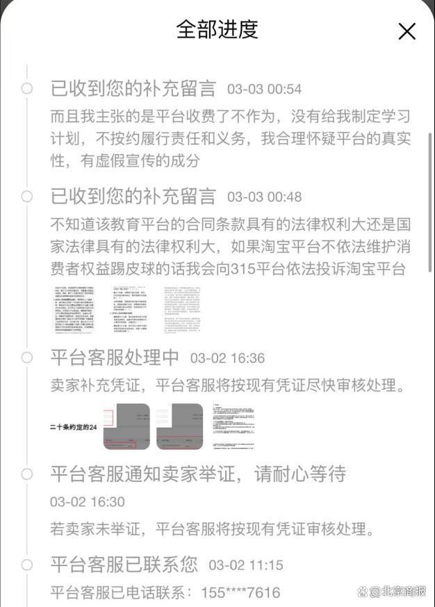 李雪晴退款成功了吗?她告诉北京商报记者,在与嗨学网客服多次沟通未果后,她申请淘宝平台介入,最终在 3 月 3 日由淘宝平台强制进行了退款。李雪晴的维权经历并不是个例,因退款难等问题,嗨学网曾被央视 "3 · 15 晚会 " 点名,其在某投诉平台上有近 8000 条相关投诉。