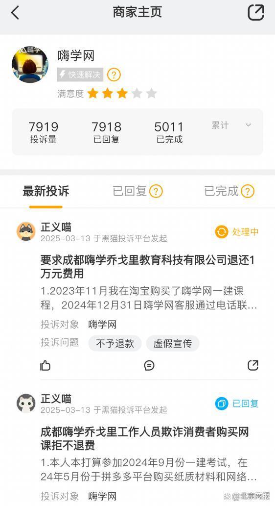 北京商报记者在黑猫投诉平台上看到,有关嗨学网的累计投诉量达到 7919 个,截至 2025 年 3 月 13 日的近 30 天累计投诉量为 146 个,投诉的问题主要集中在虚假宣传、诱导消费、不予退款等方面。