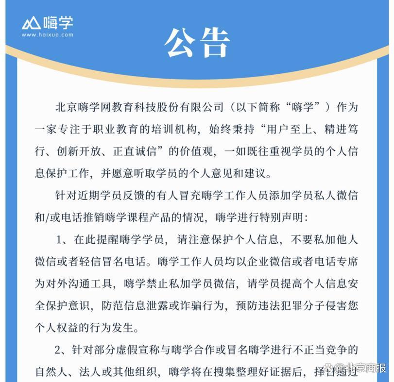 这两个细节为何值得关注?原因是在 2024 年 9 月 14 日嗨学网曾发布一则公告。公告称,近期学员反馈的有人冒充嗨学工作人员添加学员私人微信和 / 或电话推销嗨学课程产品的情况,嗨学进行特别声明:在此提醒嗨学学员,请注意保护个人信息,不要私加他人微信或者轻信冒名电话。嗨学工作人员均以企业微信或者电话专席为对外沟通工具,嗨学禁止私加学员微信,请学员提高个人信息安全保护意识,防范信息泄露或诈骗行为,预防违法犯罪分子侵害您个人权益的行为发生。