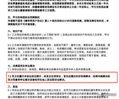 此外,在维权过程中,李雪晴在嗨学网出示的课程协议中还发现一处为消费者设置的维权障碍:在 " 第七条 法律适用及争议解决 " 中,明确提出 " 双方在履行本协议的过程中,如发生任何争议,首先应通过友好协商解决,协商未能解决的双方同意将争议提交至被告所在地人民法院诉讼解决 "。