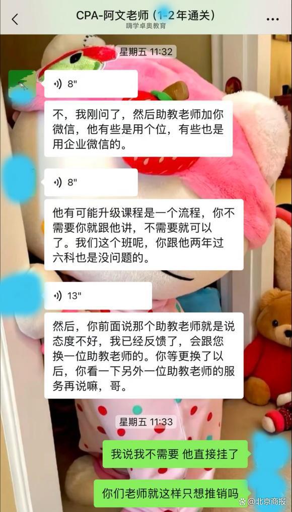 对此,李雪晴的班主任阿文老师(企微昵称为 "CPA —阿文老师(1 — 2 年通关)@嗨学卓奥教育 ")向她这样解释:" 我刚问了,助教老师加你微信,有些是用个人微信,有些也是用企业微信的。" 对于助教老师疑似使用虚拟号码的情况,阿文老师并没有回复。