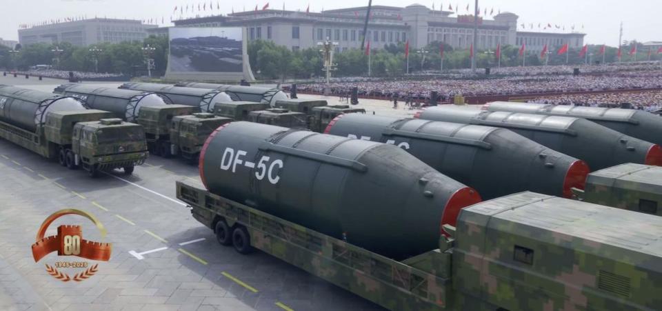 " 九三 " 阅兵上,我国还首次集中展示了陆海空基 " 三位一体 " 战略核力量,东风 -5C、东风 -61、东风 -31、巨浪 -3、惊雷 -1 等多款装备震撼亮相。其中,东风 -5C 液体洲际战略核导弹以 " 打击范围覆盖全球 " 给大家留下了深刻印象。
