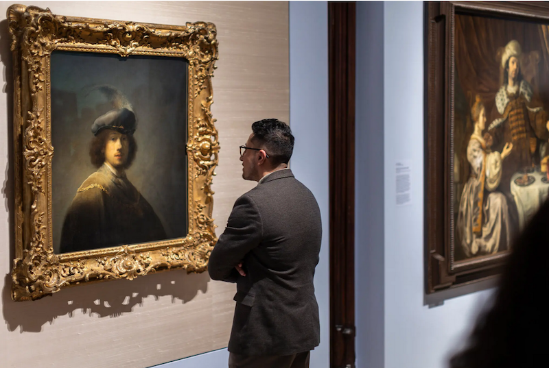 幸运的是,展览还呈现了一幅很少从波士顿伊莎贝拉·斯图尔特·加德纳博物馆(Isabella Stewart Gardner Museum)借出的杰作——伦勃朗23岁的《自画像》(1629 年)。这幅画是有史以来最有磁性的画作之一,它让我们与年轻的伦勃朗面对面。画中的伦勃朗是一个美丽的男孩,留着长长的卷发,戴着橄榄绿色的帽子,从深深的阴影中走出来,嘴唇微微张开,仿佛要从金色框架的画作中和我们对话。当然,这幅作品与以斯帖王后没什么关系。