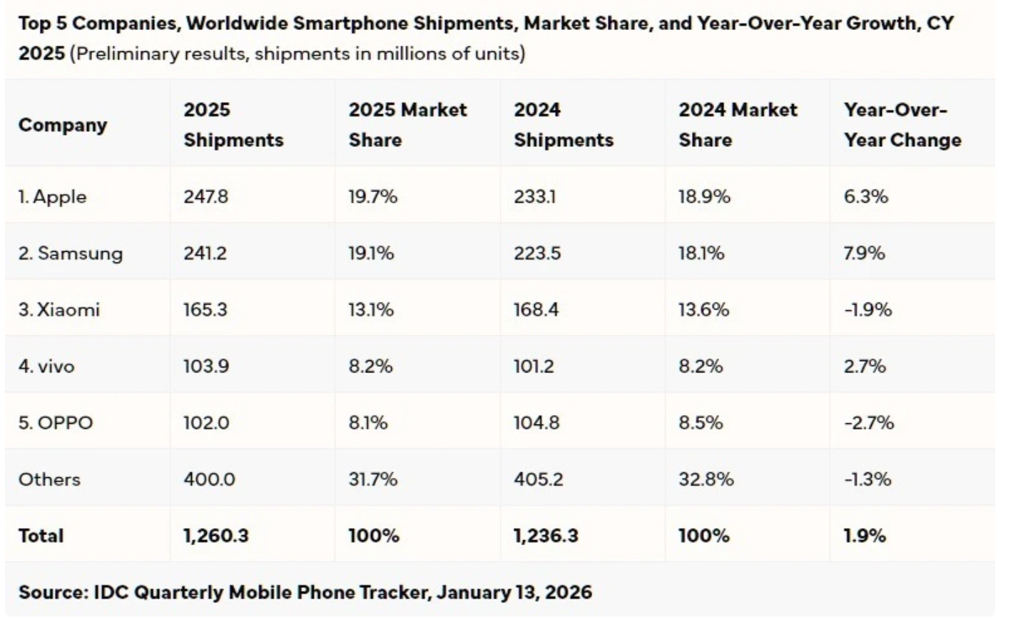 而在全球市场,2025年全球智能手机市场实现温和增长,全年出货量达12.6亿部,同比增长1.9%。