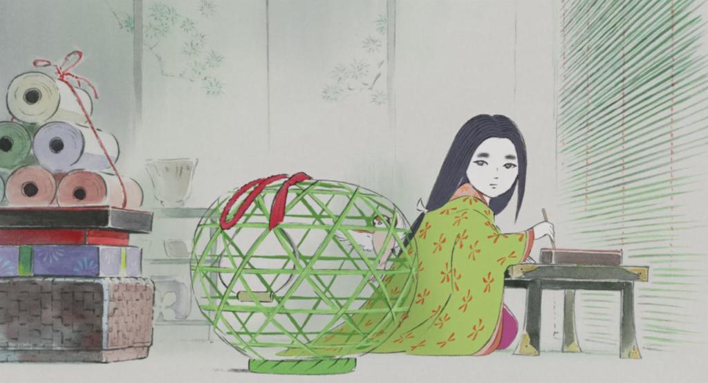 在尊严的罅隙中,辉夜姬显示出一种“弱者的自觉”,她在规定性的身不由己下,一方面故作迎合的姿态——主动学礼,另一方面又在暗中等待着自我拯救的良机——梦中回游。她无法与威严的男性凝视正面交锋,她的逃离,显然停在了对人世灰暗的绝望中,飞月恰如死亡,逃避了对现实的无能为力。