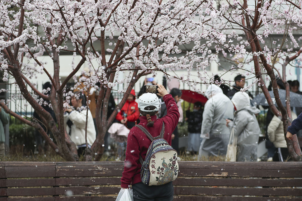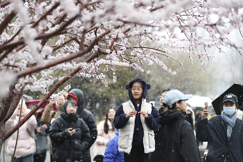 3月15日,北京市区降下春雪,市民在盛开的桃花间赏雪。