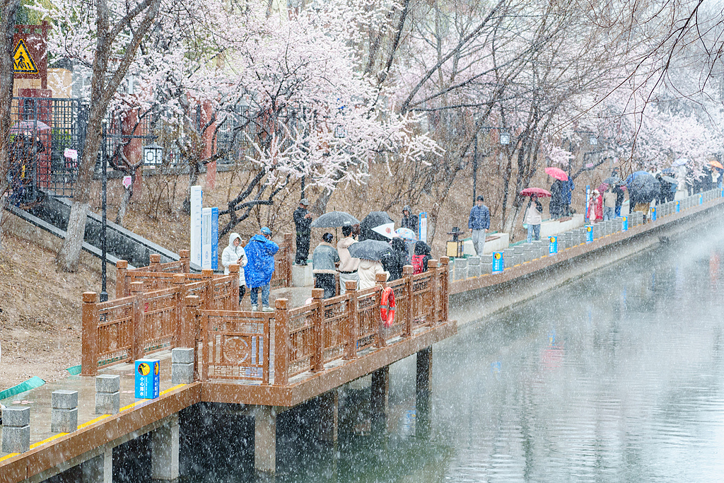 3月15日,北京,城区下起鹅毛大雪,阜成门桥的山桃花正迎最佳观赏期,粉嫩的花朵在雪中显得格外动人,构成一幅美丽的春雪画卷。