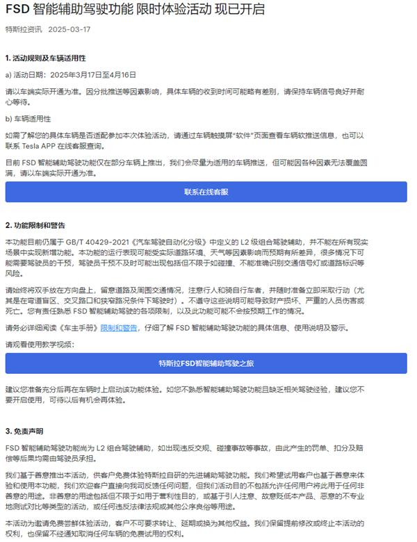 快科技 3 月 17 日消息,特斯拉中国今日下午发布称,FSD 智能辅助驾驶功能限时体验活动现已开启。