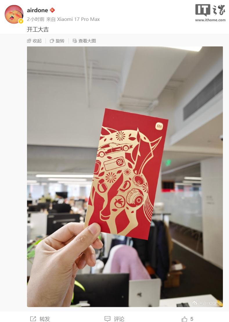 IT 之家注意到,已有小米员工晒出了开工红包,封面是一个由汽车、数码产品组成的马图案。